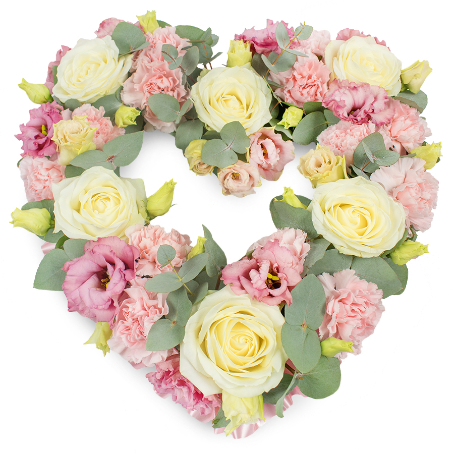 Present your deepest sympathies with our Luxurious Heart Tribute Bouquet. This sophisticated arrangement features a harmonious mix of white roses, pink carnations, pink lisianthus, and eucalyptus leaves, artistically arranged into a heartfelt heart shape that conveys your sincere condolences.